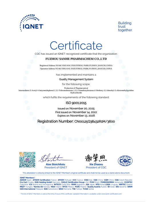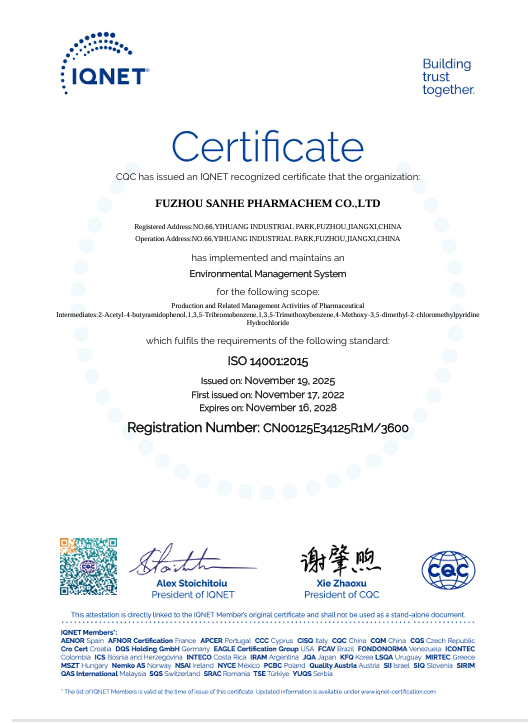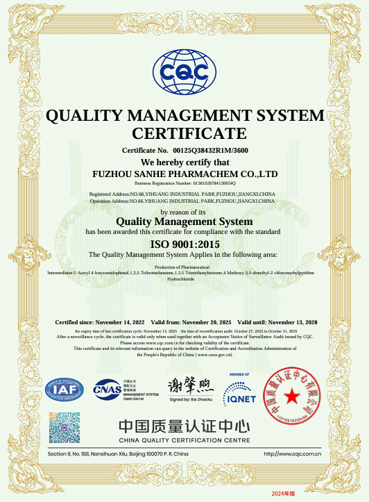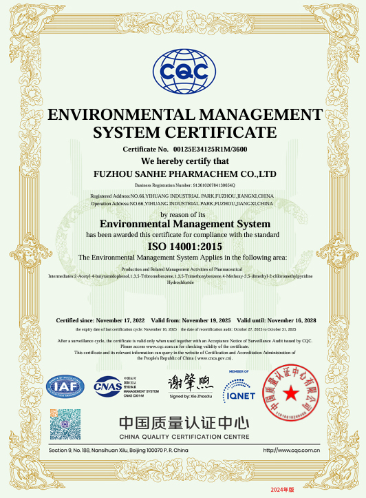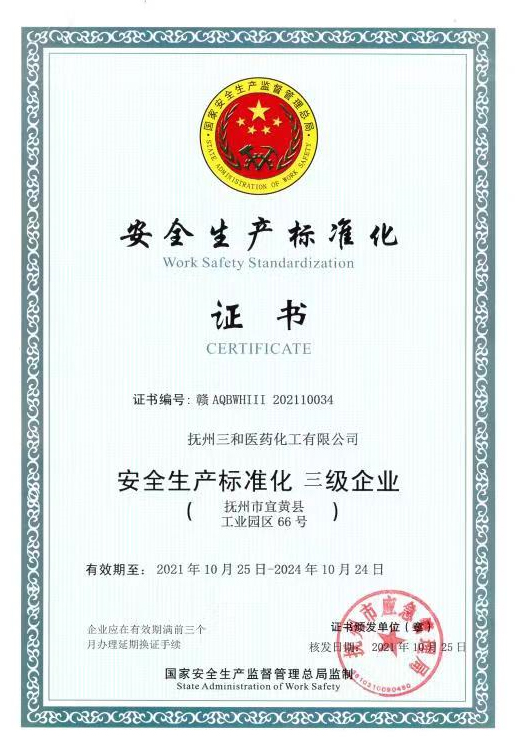 抚州三和医药化工有限公司(简称“抚州三和”)成立于2006年3月,是浙江新三和医药化工股份有限公司的分公司,公司注册资本3000万人民币,总投资2个亿,总占地面积约230亩,是一家主要从事医药中间体产品的研发、生产、经营的健康、安全、环保型民营高新技术企业。截止目前,已建有7个生产车间并已投产使用。并拥有多台不同类型和尺寸的反应设备、离心设备、干燥设备,能够满足生产需求。公司总人数200人, 其中生产人员 110人,技术人员11人 ,设备设施人员24人,EHS16人 , QA人员5人,QC人员13人 ,人员配备充足,有为客户提供优质服务的保障。