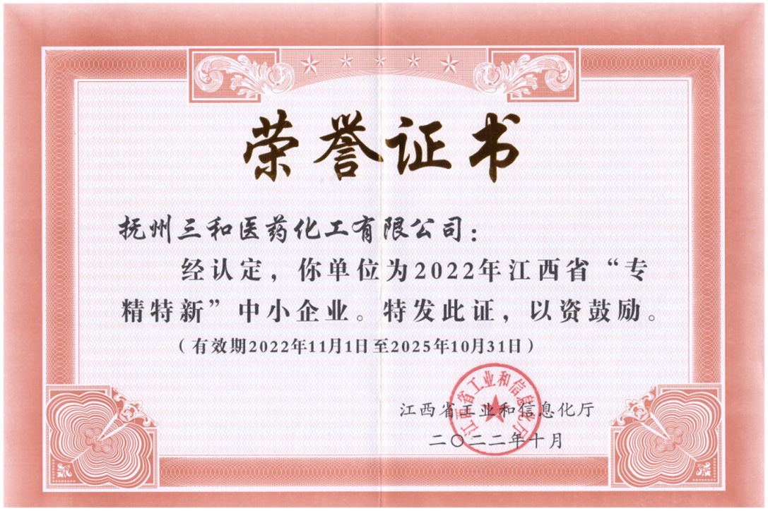 公司于2008年获得“国家高新技术企业”称号,并每三年“国家高新技术企业”复审,公司产品有列入国家重点产品,荣获过国家火炬计划,科技创新基金项目,江西省重点优秀产品,江西省科技进步奖,抚州市科技进步奖等殊荣。公司先后被评为“江西省先进非公有制企业”“江西省劳动保障AAA级企业”“抚州市优秀企业”“抚州市先进企业”“抚州市优秀科技企业”“宜黄重点企业”等。